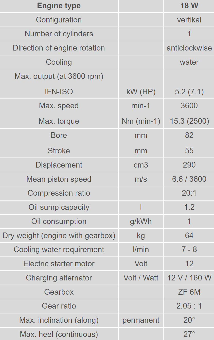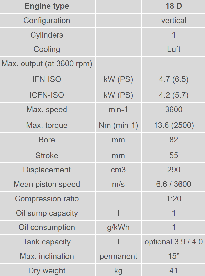 Single cylinder four stroke diesel engine, air cooled with direct injection system, save manual start with starting handle or electric starter motor, excess fuel device, automatic decompression, self-venting fuel system, mechanical governor, lubricating oil gear pump, oil filter, dry type air cleaner or oil bath air cleaner, exhaust silencer, 3.9 l fuel tank, fuel filter, crankcase of high tensile light alloy, crankshaft / con rod bearing: plain bearings on all except flywheel end (roller bearing), cast integral engine feet, power take of flywheel end, environmentally friendly by using internal crankcase breathing and valve stem seals. The engine is also available with clockwise rotation under the denomination 15 B / 18 B and in water cooled version as 15 W / 18 W.