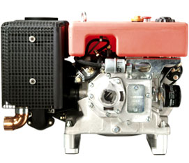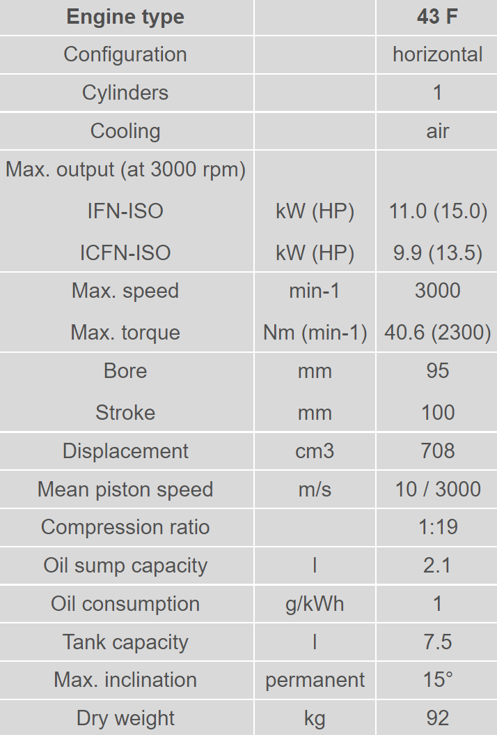 Single cylinder four stroke diesel engine, air cooled with direct injection system, save manual start with starting handle or electric starter motor, automatic excess fuel device, self-venting fuel system, mechanical governor, lubricating oil gear pump, oil filter, exhaust silencer, 7.5 l fuel tank, fuel filter, dry type air cleaner, crankcase of high tensile light alloy, crankshaft / con rod bearing: plain bearings on all except flywheel end (roller bearing), cast integral engine feet, power take of flywheel end, environmentally friendly by using internal crankcase breathing and valve stem seals, low profile due to horizontal configuration.